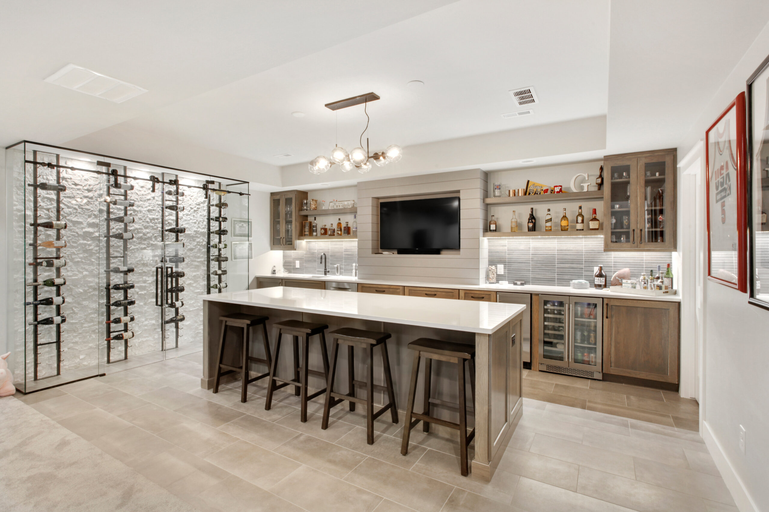 A finished lower level with a wet bar and wine storage, media room, cedar closet, guest suite with sauna, and flexible spaces.