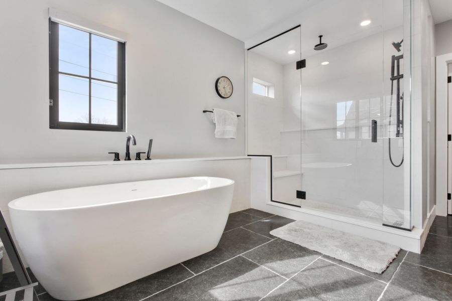 - Spa-inspired bathrooms featuring frameless glass showers, modern tile selections, and matte-black hardware.