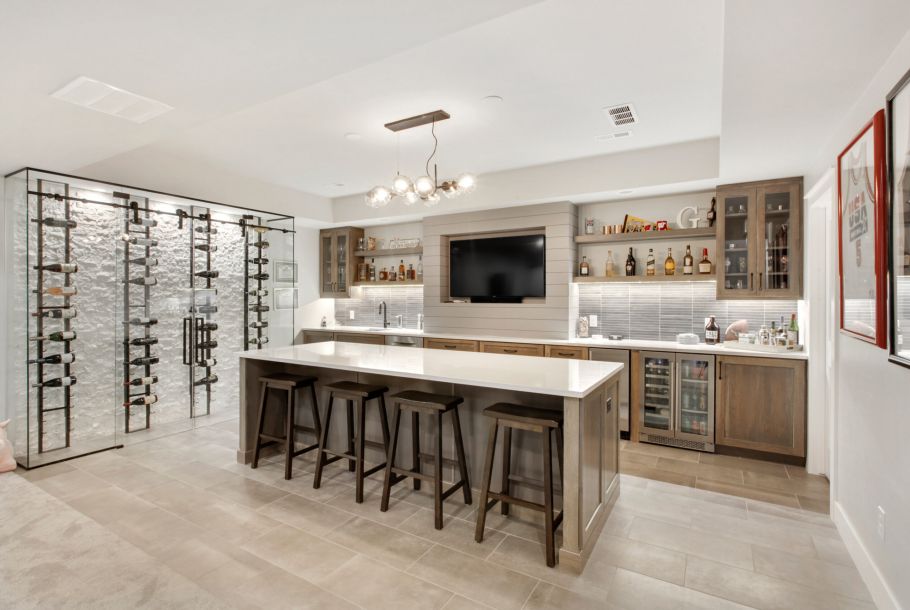 - Finished lower-level entertaining space with a full bar, large island seating, beverage refrigeration, and a glass-enclosed wine display.