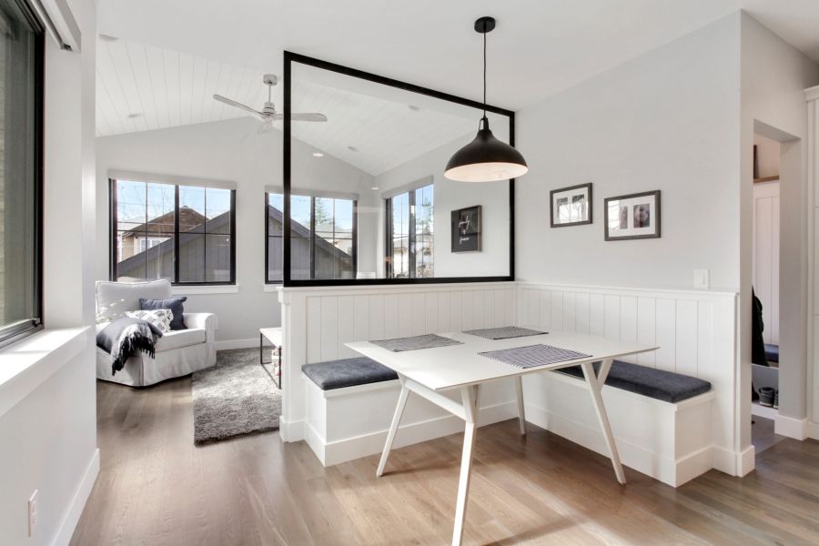 - Dedicated dining nook with built-in bench seating and contemporary lighting—ideal for casual meals or a work-from-home setup.